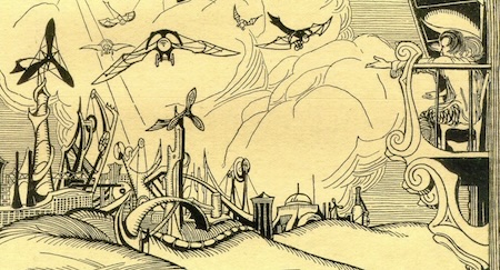 Before them in the south rose the Downs, blue at first, and as they came nearer changing to green, surmounted by the row of gigantic wind-wheels that supplemented the wind-wheels upon the roof-spaces of the city, and broken and restless with the long morning shadows of those whirling vanes. By midday they had come so near that they could see here and there little patches of pallid dots—the sheep the Meat Department of the Food Company owned.