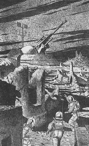 "Nothing moved or stirred. Everything was silent, dead. Only the gun showed signs of life . . . and the trespassers had wrecked that for all time. The return journey to pick up the treasure would be a cinch . . . they smiled."