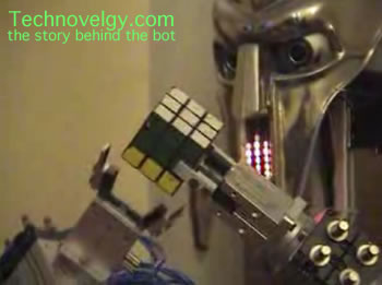 This is the second version of the RuBot, created by Pete Redmond, an avionics technician with the Irish Air Corps. The robot is able to accept a cube from a (mere) human. The 'bot then snags the cube and hoists it up to eye camera level, where its deft manipulators scan all sides of the cube.