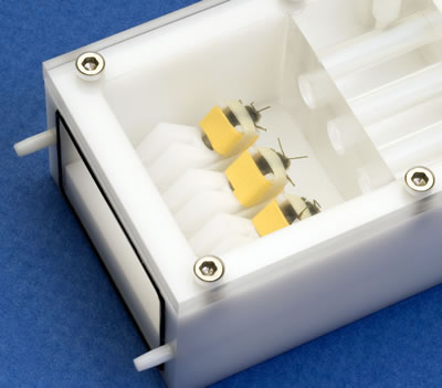 Trained bees are then carefully strapped into a cartridge. A sample of air is introduced into their little chamber. A digital camera watches the bees carefully; if the bees detect a trace of the odor that they have been trained to recognize, image recognition software will see the bees extend their proboscis in the camera image.