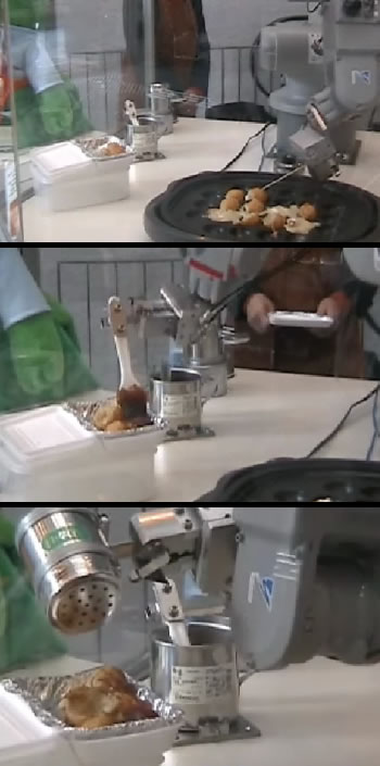 The food-savvy automaton wears a towel twisted rakishly over its upper module. The octopus balls are made individually, each one carefully made from scratch. The octopus balls are made in thirds; the cooking delicacy must be hand-turned after each portion cooks to add the next bit of dough, creating a perfect octopus ball.