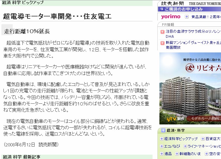 A automobile with a superconducting motor has been announced by Sumitomo Electric of Japan. The car is a modified Toyota Crown Comfort sedan powered by a 365 kilowatt superconducting motor cooled by liquid nitrogen.