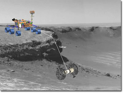 The Axel Rover prototype carries a tether, which would be attached to the larger, conventional rover robot. When conventional robots like Spirit and Opportunity encounter a crater, they cannot descend and explore. However, the Axel Rover can.