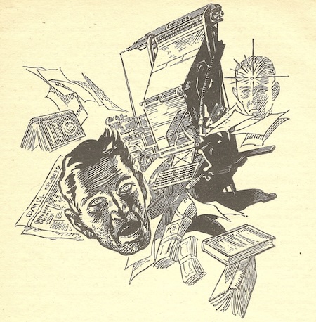 This is an early, explicit description of what is now called machine learning training, giving an AI a lot of text to analyze or summarize. Spoiler! It turns out that this gives the printer a chance to get it to stop.